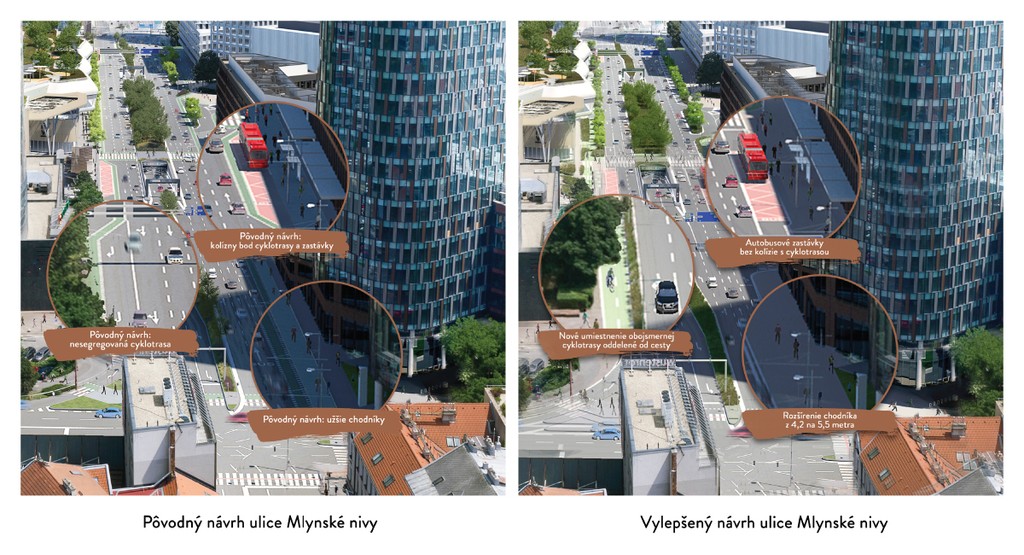 Presunutá bude cyklotrasa na severnú stranu ulice s tým, že bude obojsmerná a bezpečne oddelená od cesty. Tým majú zaniknúť doposiaľ naprojektované kolízne body v priestore zastávok MHD. "Takéto riešenie umožní realizáciu obojsmernej cyklotrasy aj v časti južnej strany ulice po zrušení dočasnej autobusovej stanice," podotkol hovorca.