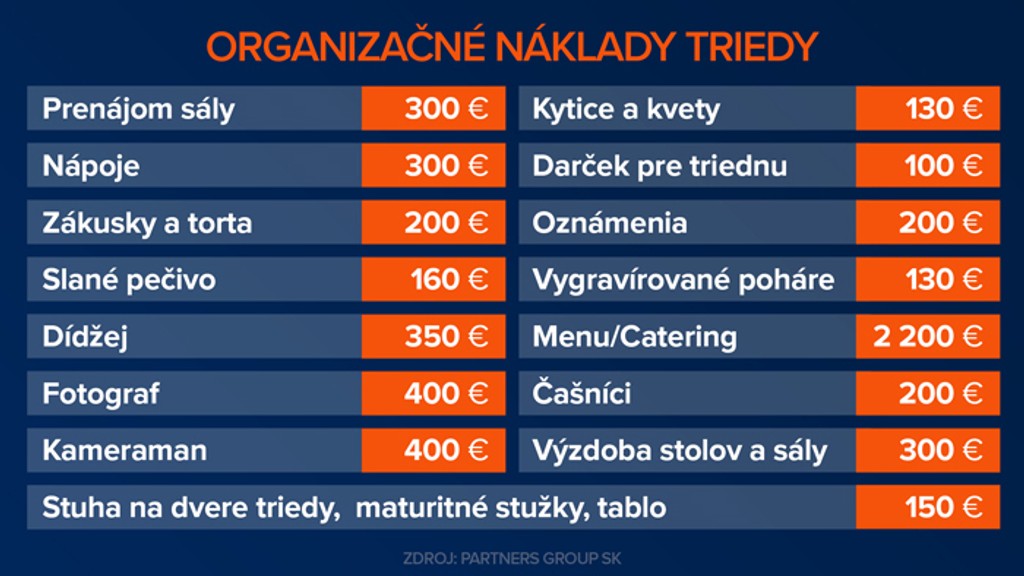 Na triedu treba orientačne počítať s počtom hostí 150, rozmenené na drobné - 30 stredoškolákov v triede, rodičia, partneri a profesori.
