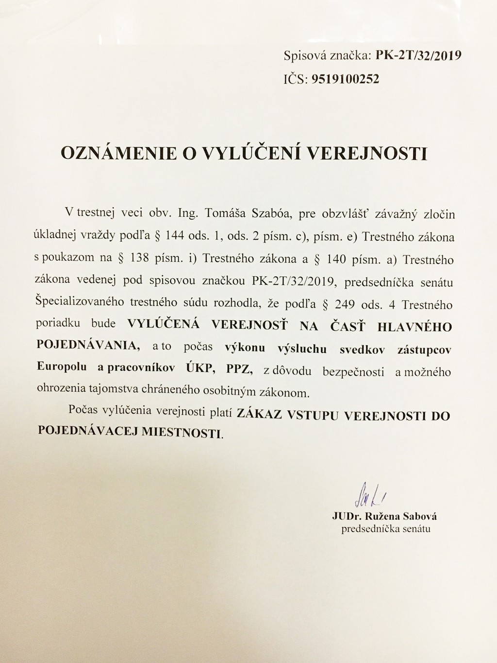 10.45 - V ďalšej časti pojednávania budú experti hovoriť, ako dešifrovali informácie z vecných dôkazov. Verejnosť a média budú vylúčené, aby nepočuli metódy, akými Europol odhaľuje trestnú činnosť. Marian Kočner a Tomáš Szabó však v pojednávacej miestnosti ostanú, pretože obžalovaných nie je možné z pojednávania vylúčiť.
