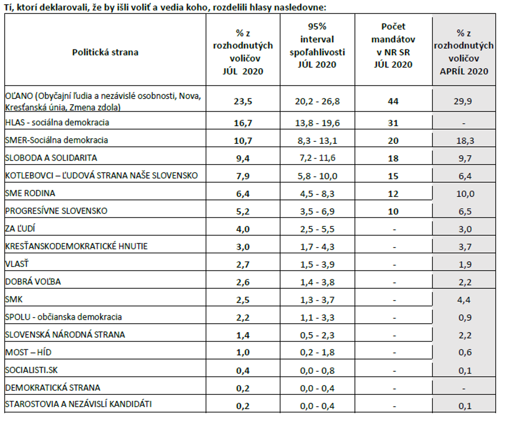 Agentúra merala preferencie v júli po uplynutí 100 dní Matovičovej vlády. Prieskum zachytil aj kauzu diplomovky predsedu parlamentu Borisa Kollára. Z opýtaných by nešlo voliť 14,4 percenta, 4,3 percenta nechcelo odpovedať a 15,9 percenta opýtaných nevedelo povedať, koho by išli voliť.