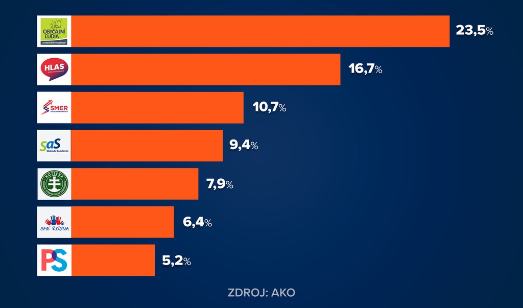 Agentúra AKO merala preferencie politických strán. Vo vedení je stále hnutie OĽaNO Igora Matoviča. Voľby by vyhralo s 23,5 percentami. Nasleduje HLAS Petra Pellegriniho s 16,7 percentami.