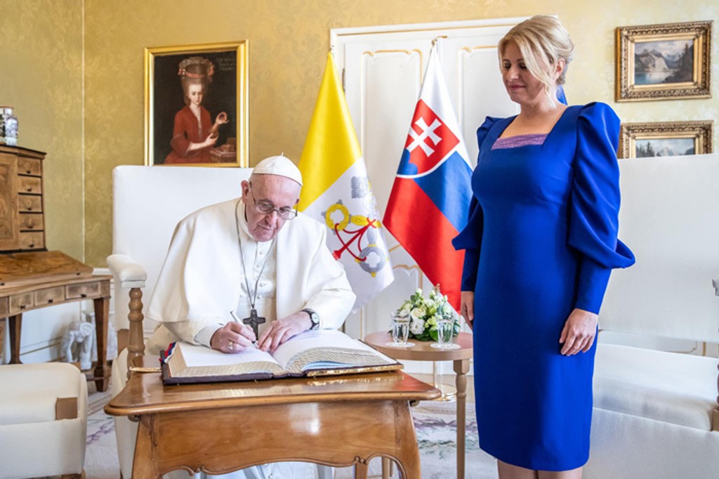 09.15 - Prezidentka sa stretla s Františkom v Prezidentskom paláci. Zuzana Čaputová sa spoločne s pápežom presunula na stretnutie medzi štyrmi očami do zlatého salóna v Prezidentskom paláci. Prítomný tam bude aj tlmočník, pretože Čaputová bude počas schôdzky hovoriť v slovenskom jazyku a pápež v talianskom.