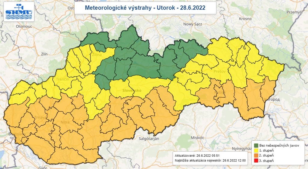 Kritickejšia situácia nastane v utorok, kedy dali druhý stupeň výstrahy pred horúčavami až pre 32 okresov. Zároveň bude platiť výstraha prvého stupňa pre 29 okresov. Kritické tepoty budú tiež v poobedných hodinách od 14.00 do 18 hodiny. Normálne teploty budú len na severe Slovenska.