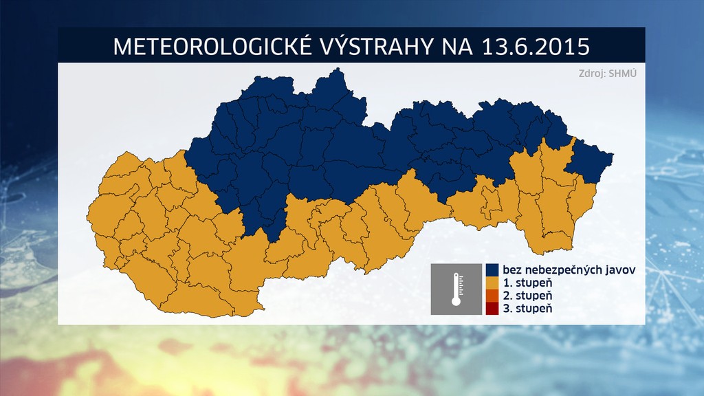 Výstraha Slovenského hydrometeorologického ústavu (SHMÚ) prvého stupňa platí na sobotu od 13.00 do 18.00 h pre celé Slovensko s výnimkou Žilinského kraja.