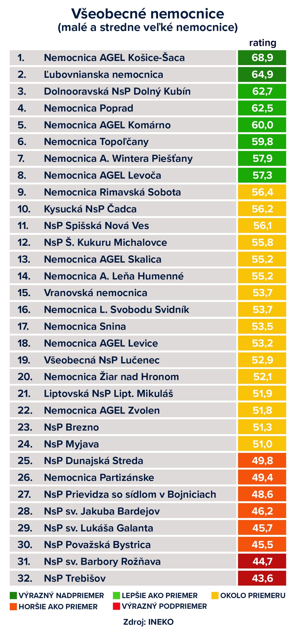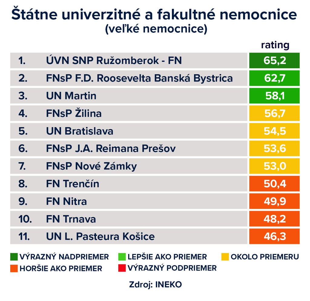 Najlepšou štátnou univerzitnou a fakultnou nemocnicou tohto roka je Ústredná vojenská nemocnica v Ružomberku, najlepšou všeobecnou nemocnicou je tretíkrát Nemocnica Agel Košice-Šaca. Vyplýva to z ôsmeho ročníka hodnotenia nemocníc, ktoré vychádza najmä z dát rokov 2018 až 2021. Informoval o tom Dušan Zachar, riaditeľ Inštitútu pre ekonomické a sociálne reformy (INEKO), ktorý hodnotenie realizuje.