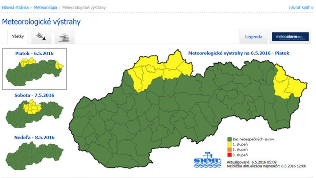 Ešte dnes môže sem tam spŕchnuť, ale teploty už budú veľmi príjemné. Najvyššia denná teplota 19 až 24, na Kysuciach, Orave, Liptove, Spiši a na Horehroní väčšinou okolo 17 stupňov. Teplota na horách vo výške 1500 m okolo 8 stupňov. Fúkať bude slabý, na severe a východe severný až severovýchodný vietor 5 až 25 km/h, miestami v nárazoch okolo 45 km/h. Informuje na svojej stránke Slovenský hydrometeorologický ústav.