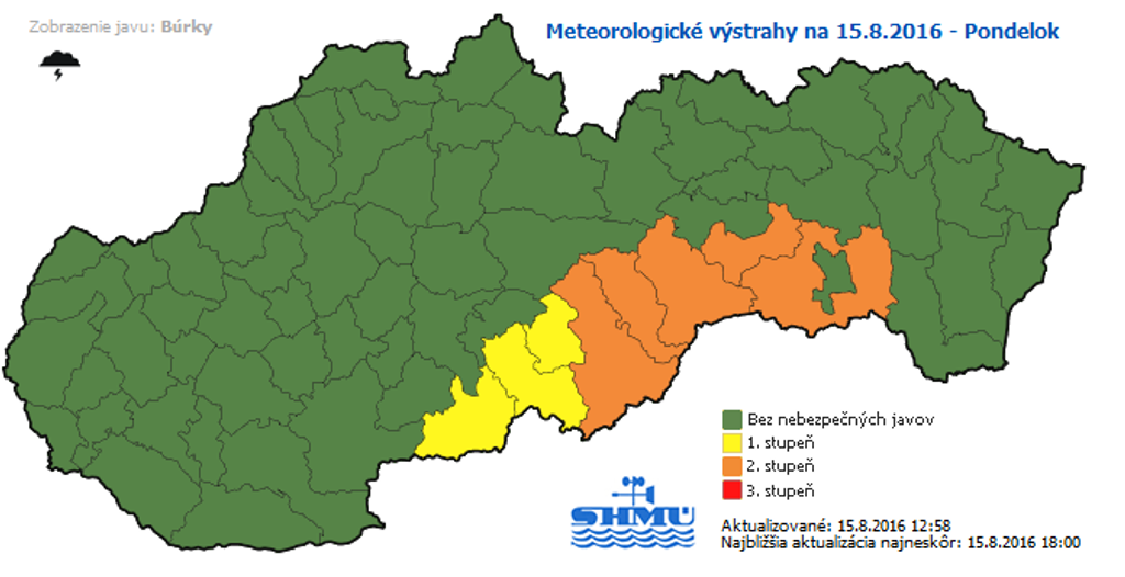 Na juhu stredného a východného Slovenska hrozia dnes popoludní búrky s krúpami. Slovenský hydrometeorologický ústav (SHMÚ) preto vydal do dnešnej 15.20 h výstrahu 1. stupňa pre okresy Veľký Krtíš, Lučenec a Poltár. O stupeň vyššia výstraha platí pre okresy Rimavská Sobota, Revúca, Rožňava, Gelnica a Košice-okolie.