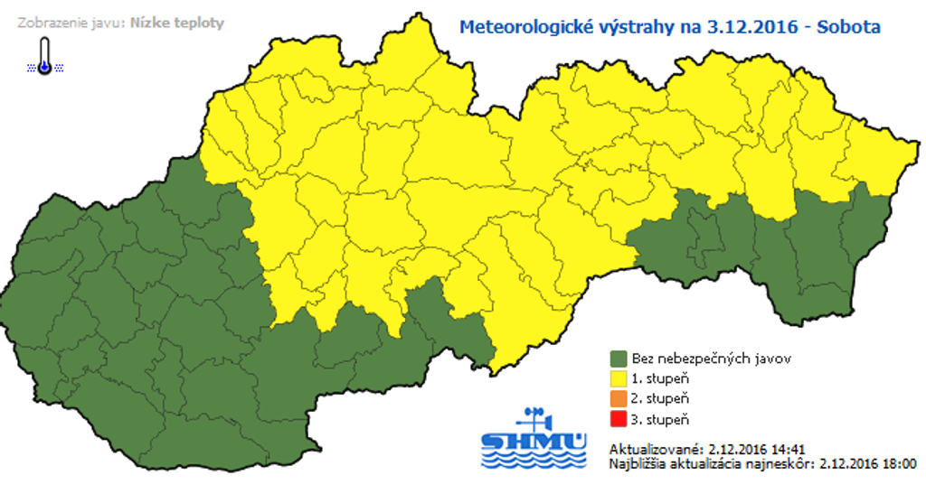 Po výdatnej nádielke snehu sa na Slovensku počas víkendu ochladí. Slovenský hydrologický ústav (SHMÚ) vydal pre noc zo soboty (3. 12.) na nedeľu (4. 12.) výstrahu pred nízkymi teplotami prvého, najnižšieho stupňa.