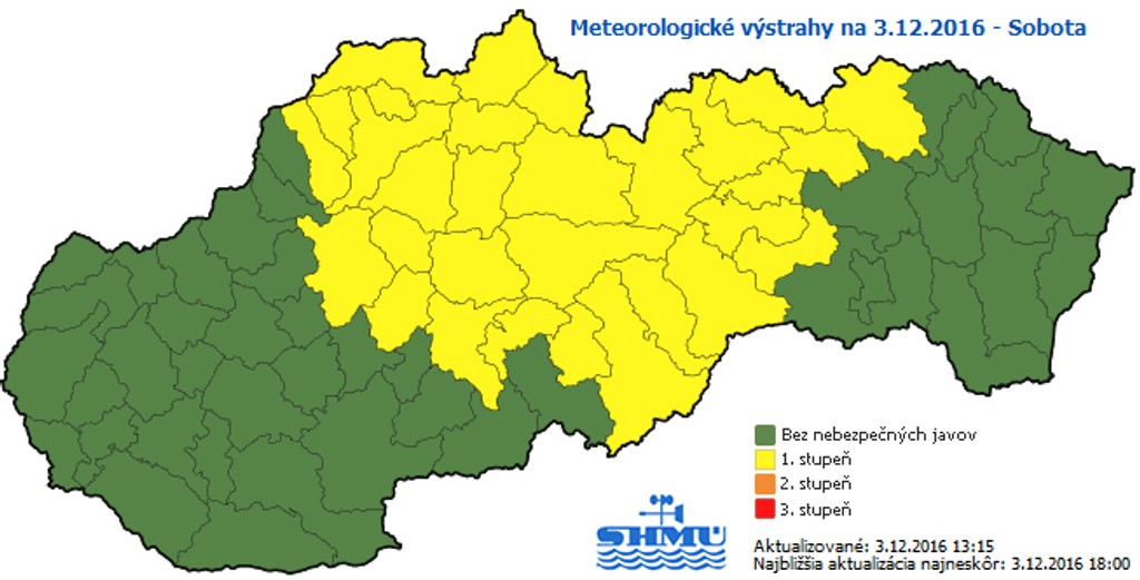 Meteorológóvia vydali výstrahu 1. stupňa pred mínusovými teplotami. Týka sa to okresov stredu Slovenska, západ a východ bude bez nebezpečných javov, informuje SHMÚ na svojej stránke. Výstraha začne platiť od soboty (3. 12.) 22.00 h a potrvá do nedeľného (4. 12) rána do 08.00 h. Teploty by sa mali pohybovať od -15 do -17 stupňov.