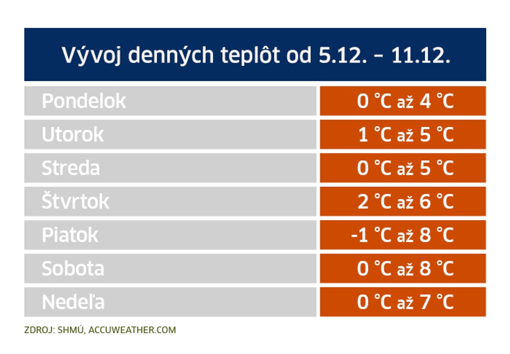 Vyhliadky na tento týždeň sú však priaznivé. Ku koncu týždňa by sa malo mierne otepliť, teploty by na niektorých miestach mohli stúpnuť až o 8 stupňov. Chladnejšie bude na Kysuciach, Orave, Liptove a Spiši.