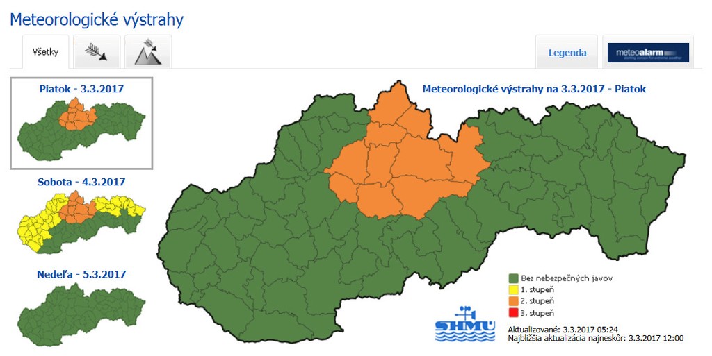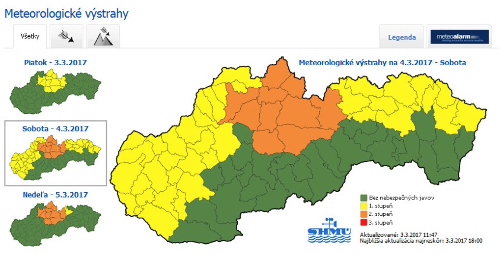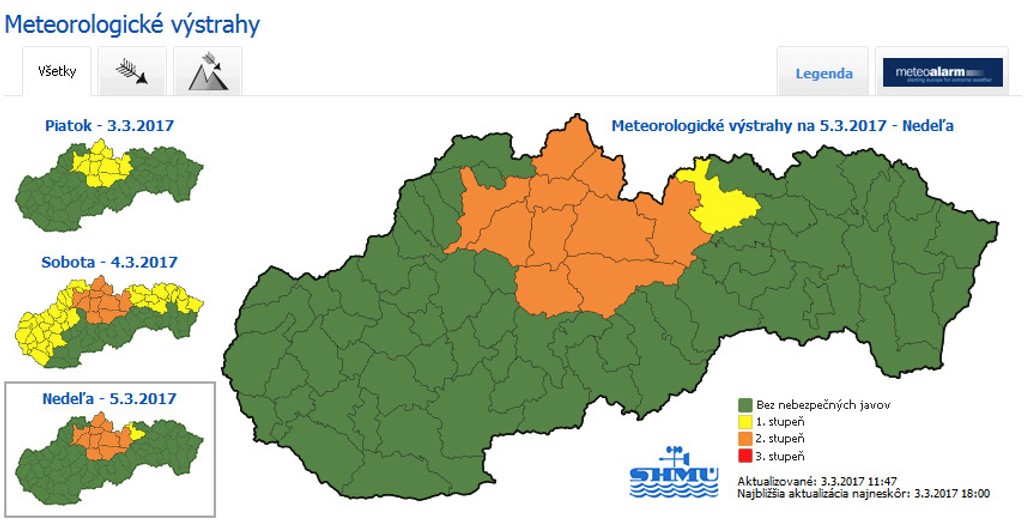 SHMÚ vydalo výstrahu 2. stupňa pre okres Liptovský Mikuláš, kde sa na horách nad 1500 metrov miestami očakáva výskyt silného vetra, ktorý dosiahne krátkodobo v nárazoch rýchlosť 32 - 40 m/s (115 - 145 km/h).