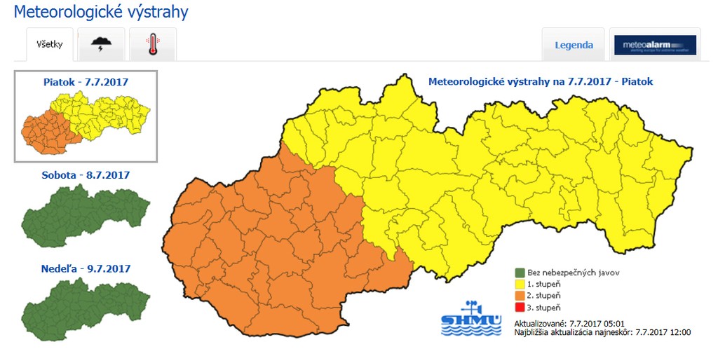 Meteorológovia v tejto súvislosti vydali výstrahu 2. stupňa pre územie Bratislavského, Trenčianskeho, Trnavského kraja a okresy Banská Štiavnica, Žiar nad Hronom, Krupina a Veľký Krtíš. Výstraha platí dnes od 16. do 23.00 h. Pre zvyšok krajiny platí výstraha 1. stupňa s platnosťou od 14.00 h do soboty (8.7.) 00.00 h.