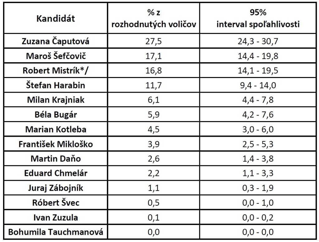 Ak by sa prezidentské voľby konali koncom februára, ľudia by najviac volili Zuzanu Čaputovú (27,50 percenta). Na druhom mieste by skončil Maroš Šefčovič so 17,10 percentami a trojicu uzatvára Robert Mistrík so 16,80 percentami, ktorý sa medzičasom vzdal.