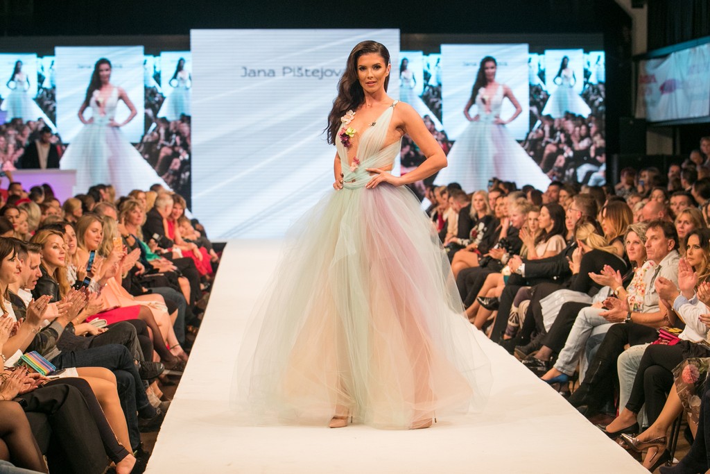 Okrem Verešovej predvádzala šaty aj modelka Soňa Skoncová. Tá v nebesko-modrých šatách od Pištejovej pôsobila ako víla z rozprávky.