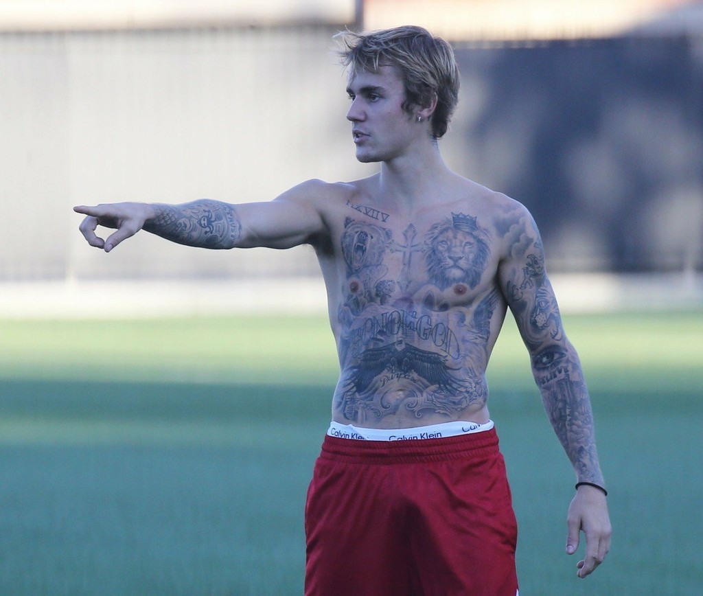 Dvadsaťtriročný kanadský spevák ukázal asi sto oddaným fanúšičkám, ktoré sledovali zápas spoza plota, čerstvo potetovanú hruď. Toľká pozornosť ho ale potešila natoľko, že zákonom prírody skrátka nedokázal zabrániť a "tam dole" bolo všetko v pozore.