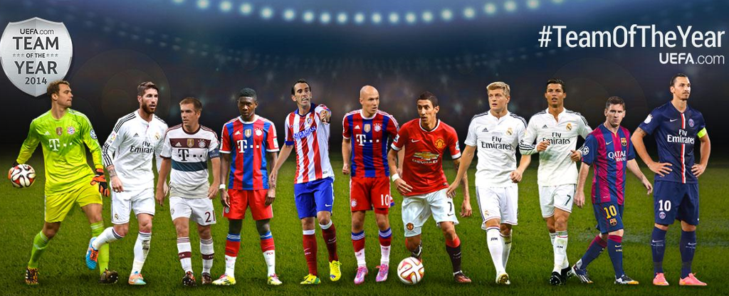 Štyria futbalisti Bayernu Mníchov a traja z Realu Madrid figurujú v Jedenástke roka UEFA podľa hlasovania fanúšikov na oficiálnej stránke Európskej futbalovej únie. Jedným hráčom sú zastúpené aj kluby Atletico Madrid, Manchester United, FC Barcelona a Paríž St. Germain.