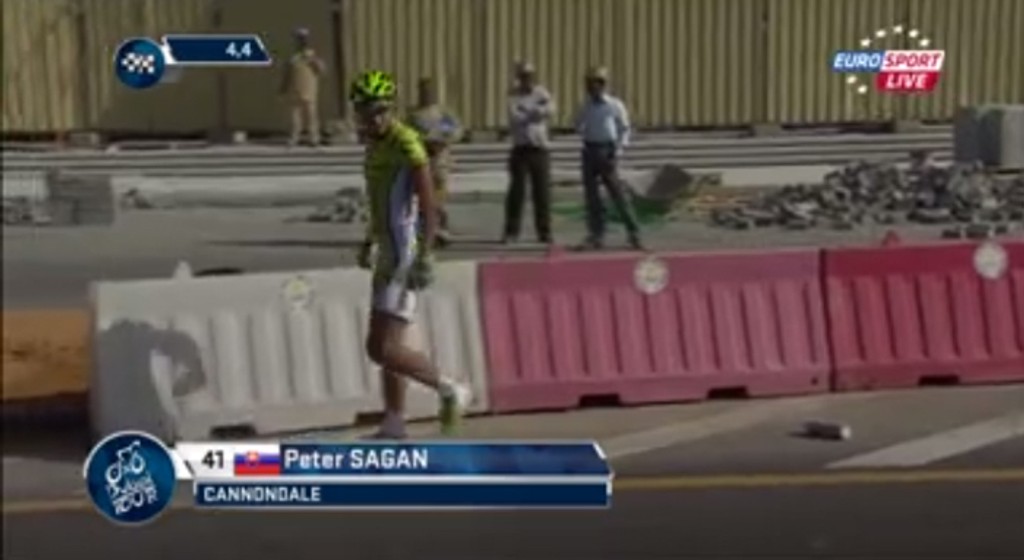 Slovenský reprezentant Peter Sagan z tímu Cannondale sobotňajšiu záverečnú etapu nedokončil. Po kolízii s jedným z jazdcov 4,3 km pred cieľom spadol a v pretekoch už nepokračoval. Televízne zábery ukázali, ako nahnevaný Sagan v hneve odhodil svoj bicykel do ochranných bariér.
