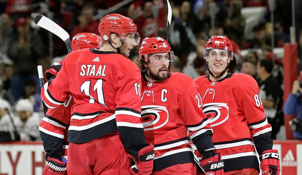 7. Slavin (Staal, Pesce), 9. Faulk (Williams, Rask), 18. Faulk (Aho, Teräväinen), 22. Faulk (Aho, Teräväinen), 28. Skinner (Rask, Williams), 55. Skinner (Di Giuseppe), 57. Aho (Teräväinen) - 32. Kopitar (Muzzin, Toffoli), 38. Toffoli (Pearson, Kopitar), 47. Mitchell (Clifford, Doughty). Brankári: Ward - Quick (22. Kuemper), 12.805 divákov.