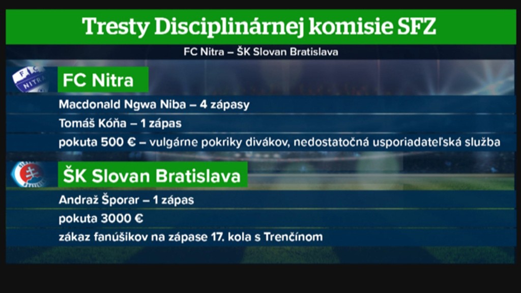 Disciplinárka trestala aj samotných hráčov, Šporarovi a Kóňovi udelila za vylúčenie po druhej žltej karte stopku na jedno stretnutie, o niečo horšie dopadol Niba, ktorý za udretie súpera a odkopnutie fľašky s vodou dostal štvorzápasový trest. V riešení však aj naďalej zostáva najlepší strelec Fortuna ligy a jeho údajné poškodenie stropu nitrianského štadióna.