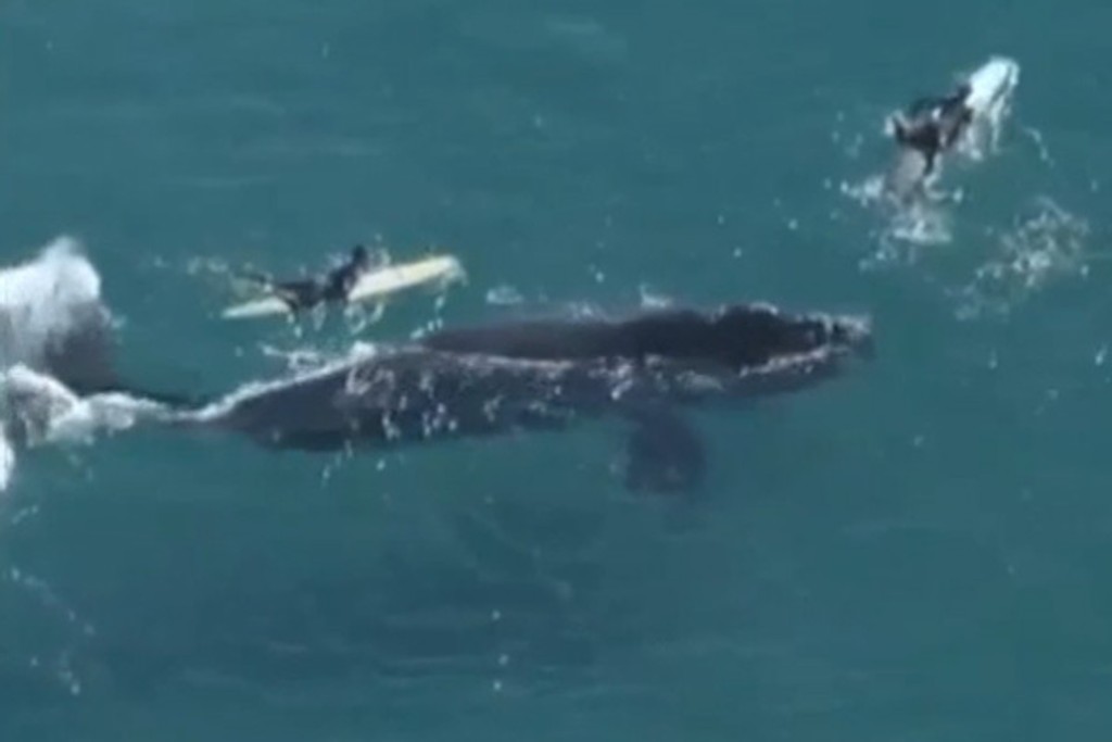 Na záberoch z vrtuľníka je vidieť, ako jeden surfista rýchlo uniká, keď veľryba urobí ostrú zákrutu smerom k nemu. Druhý muž sa drží ďalej a sleduje ju z diaľky.