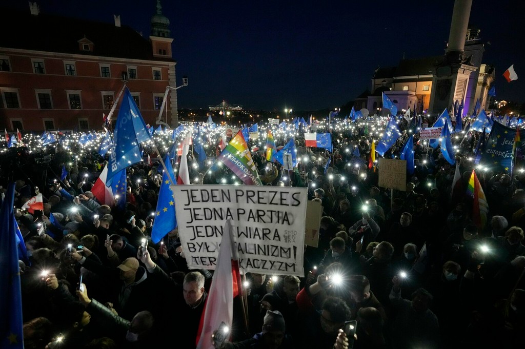 Tisíce ľudí demonštrovali v nedeľu v Poľsku proti kontroverznému verdiktu Ústavného súdu a za zotrvanie svojej krajiny v Európskej únii. Informovali o tom agentúry DPA a AP.