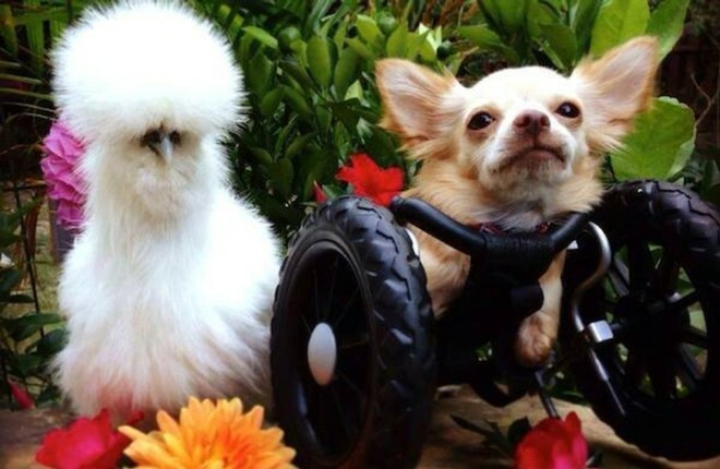 Nezvyčajná dvojica priateľov si už získala mnoho fanúšikov. Fotografie psíka a kuraťa zaujali tisíce ľudí. Penny je biele načuchrané kura, ktoré zachránili za pokusného laboratória a Roo je dvojnohá čivava odkázaná na "invalidný vozík".