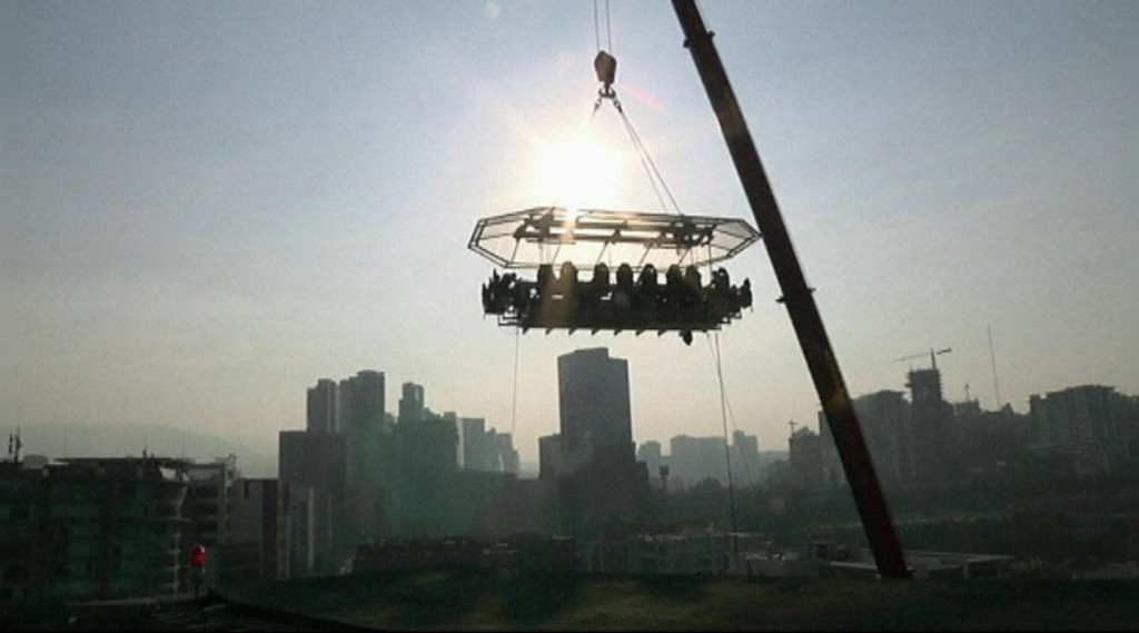 Najskôr sa treba poriadne pripútať, vypočuť si inštrukcie a potom už len v zdraví prežiť cestu hore. Plošina sa zastaví vo výške 50 metrov nad mexickou metropolou. Vtedy sa už začína pravá kulinárska šou.