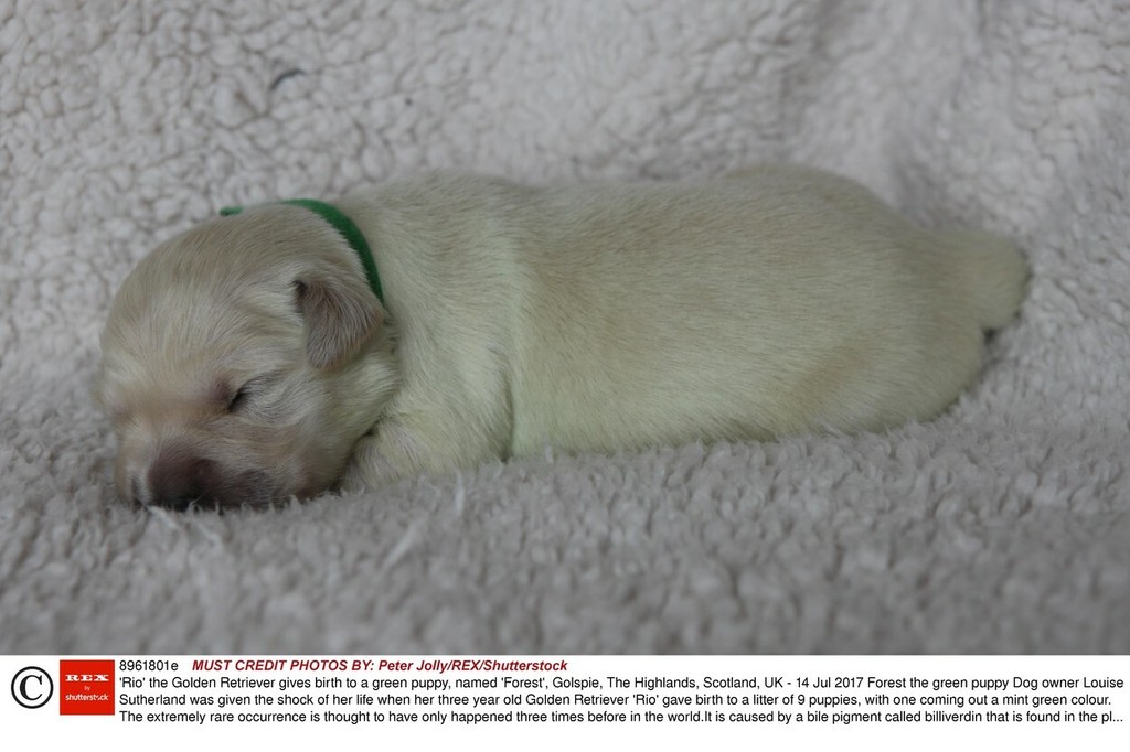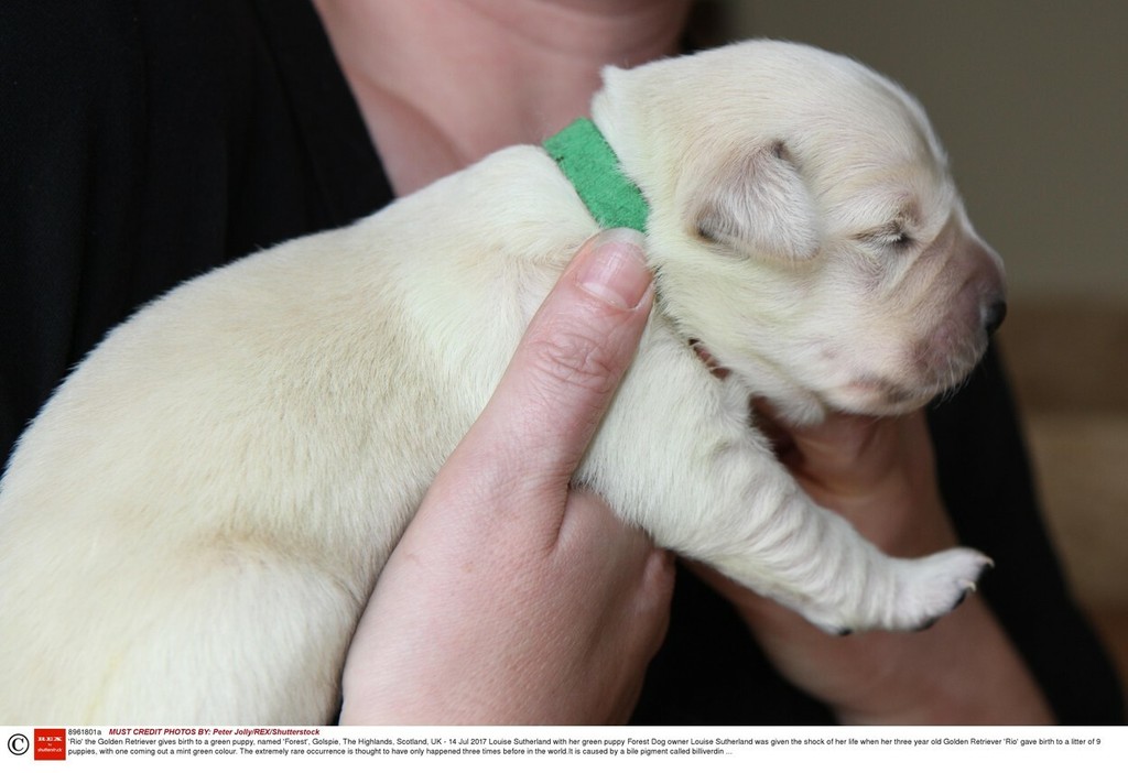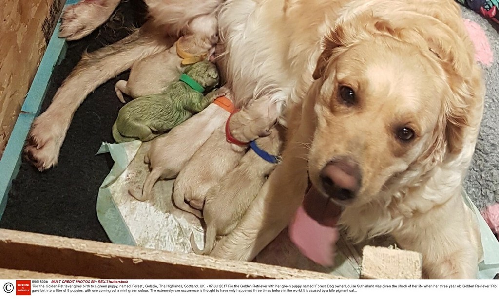 Louise Sutherland z dediny Golspie v Škótsku nemohla uveriť vlastným očiam, keď jej sučka zlatého retrívera priviedla na svet zelené šteniatko. Trojročná Rio porodila dokopy deväť šteniatok pred dvoma týždňami. Informuje The Sun.
